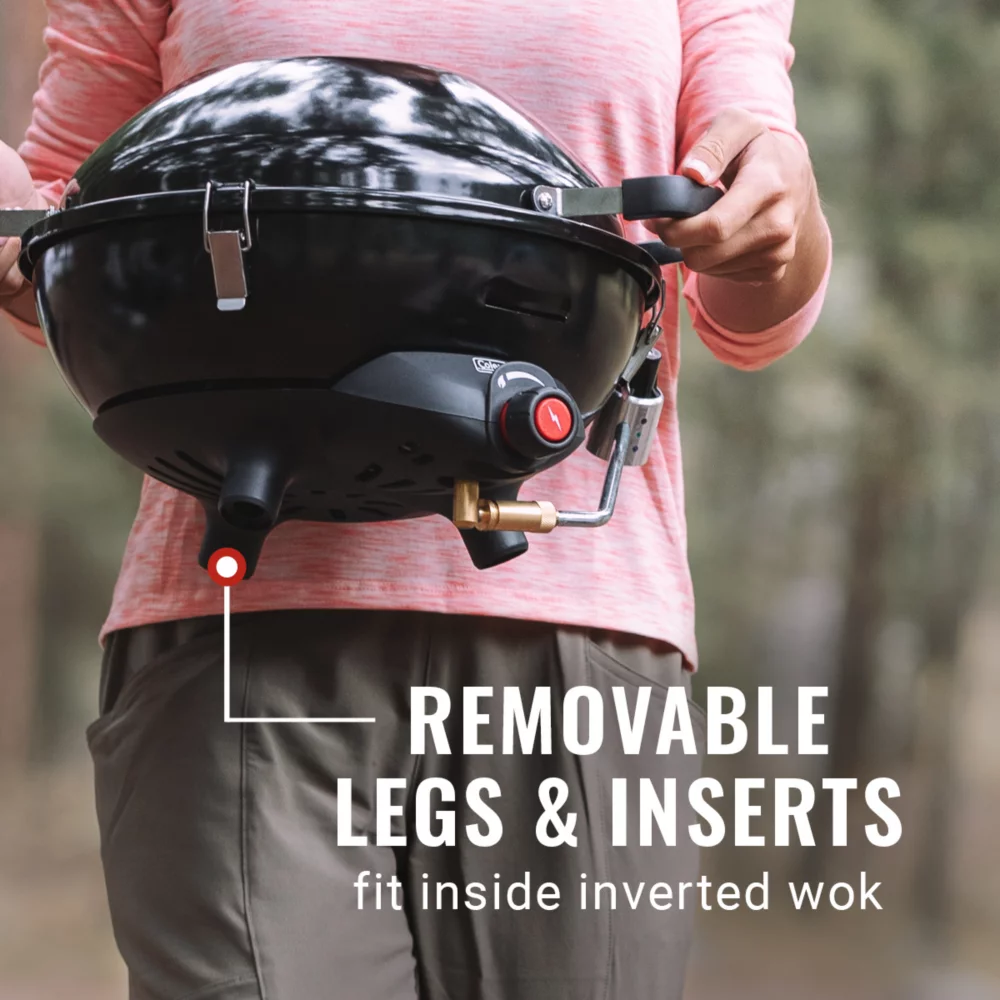 - Removable legs and inserts fit inside inverted wok for easy storage