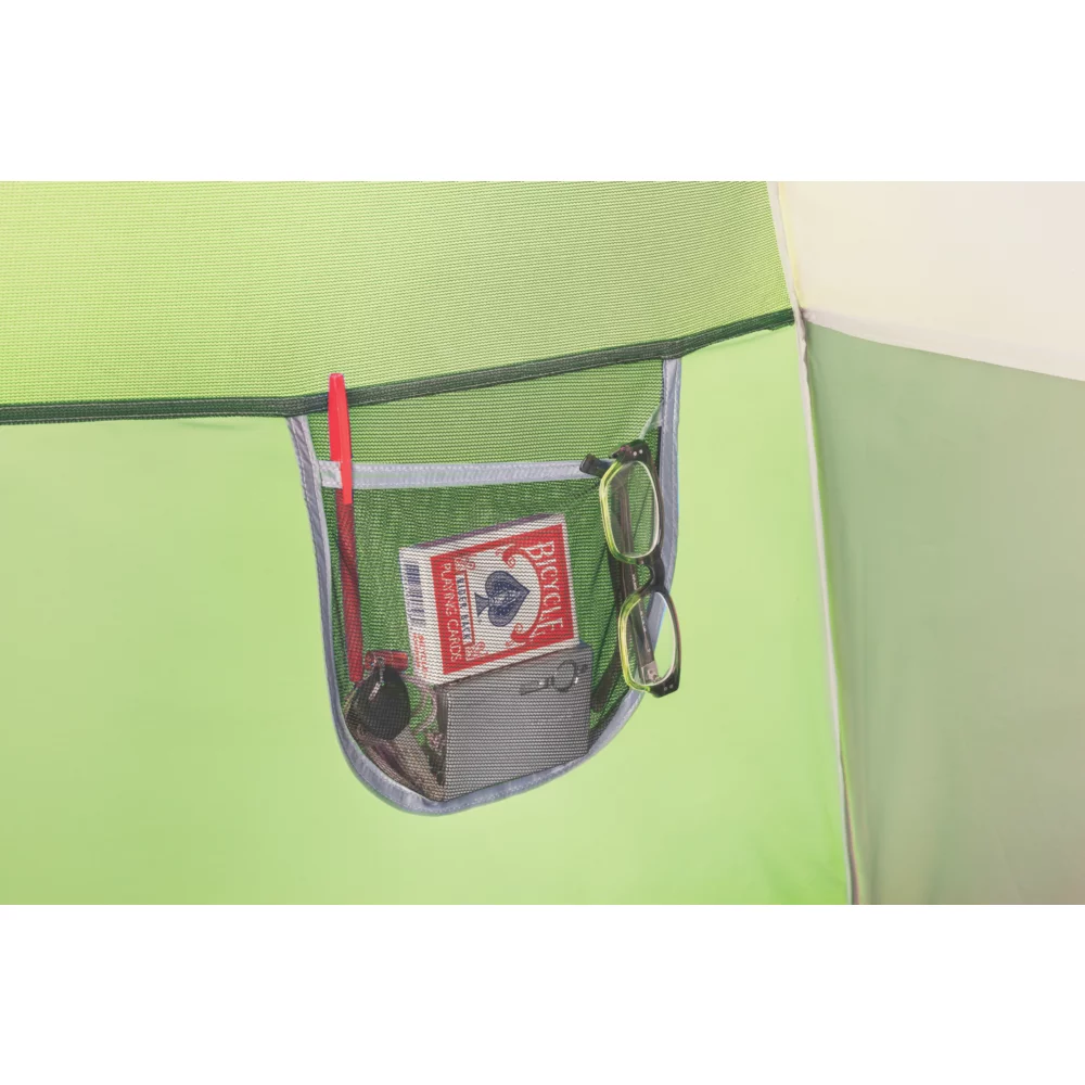 The extended awning of the 6-Person Montana™ Cabin Camping Tent helps keep your tent cleaner and drier by preventing the tracking in of dirt and mud. Enjoy additional weather protection with angled windows, an included rainfly, and a WeatherTec™ system that keeps water from getting in.